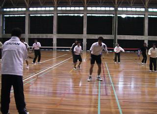 前衛はスマッシュをねらうが、相手のシュートもケアしなくてはならない。1本マッチで交代。負けた方はスクワット。サービスミスもスクワット。
